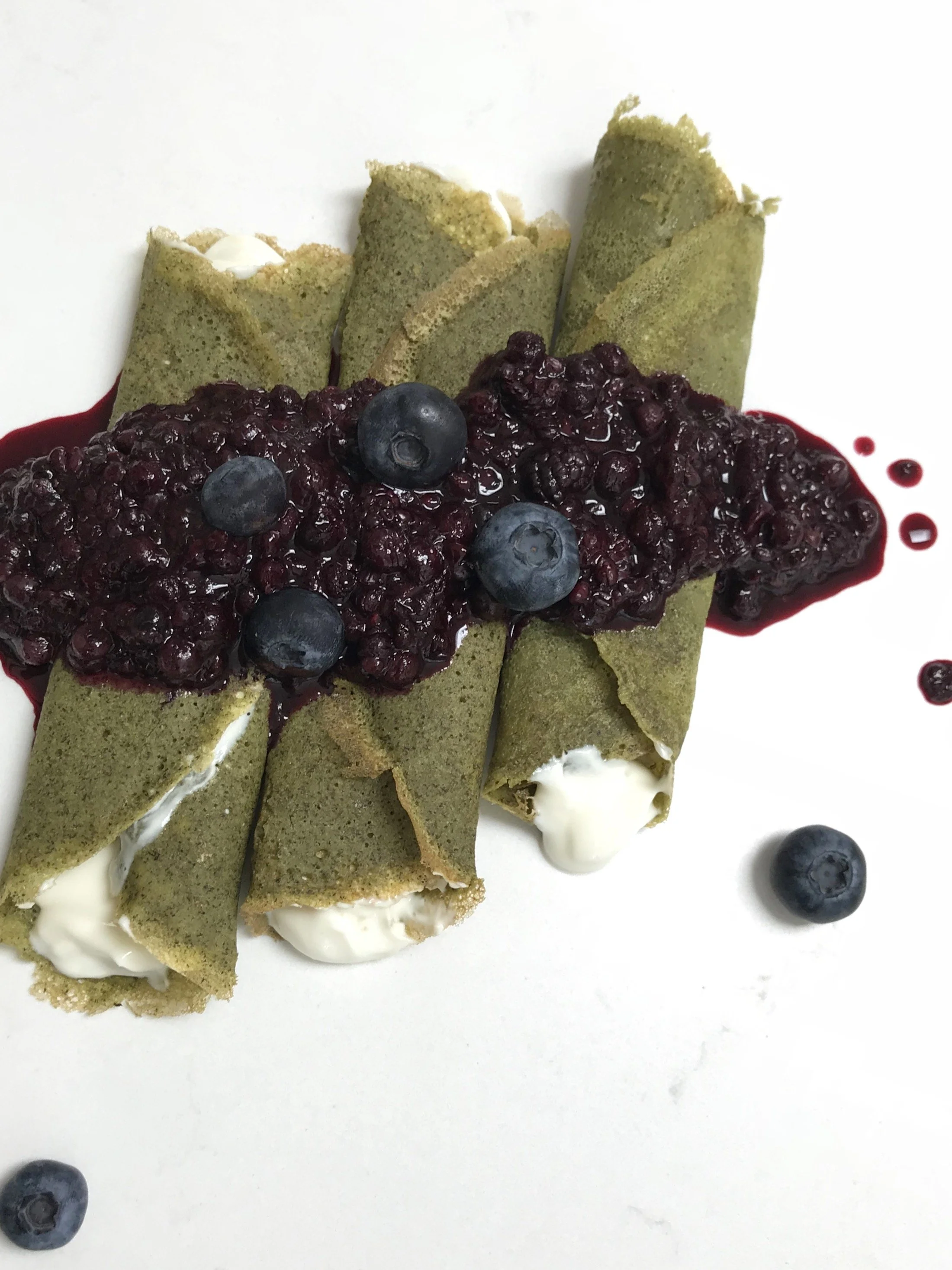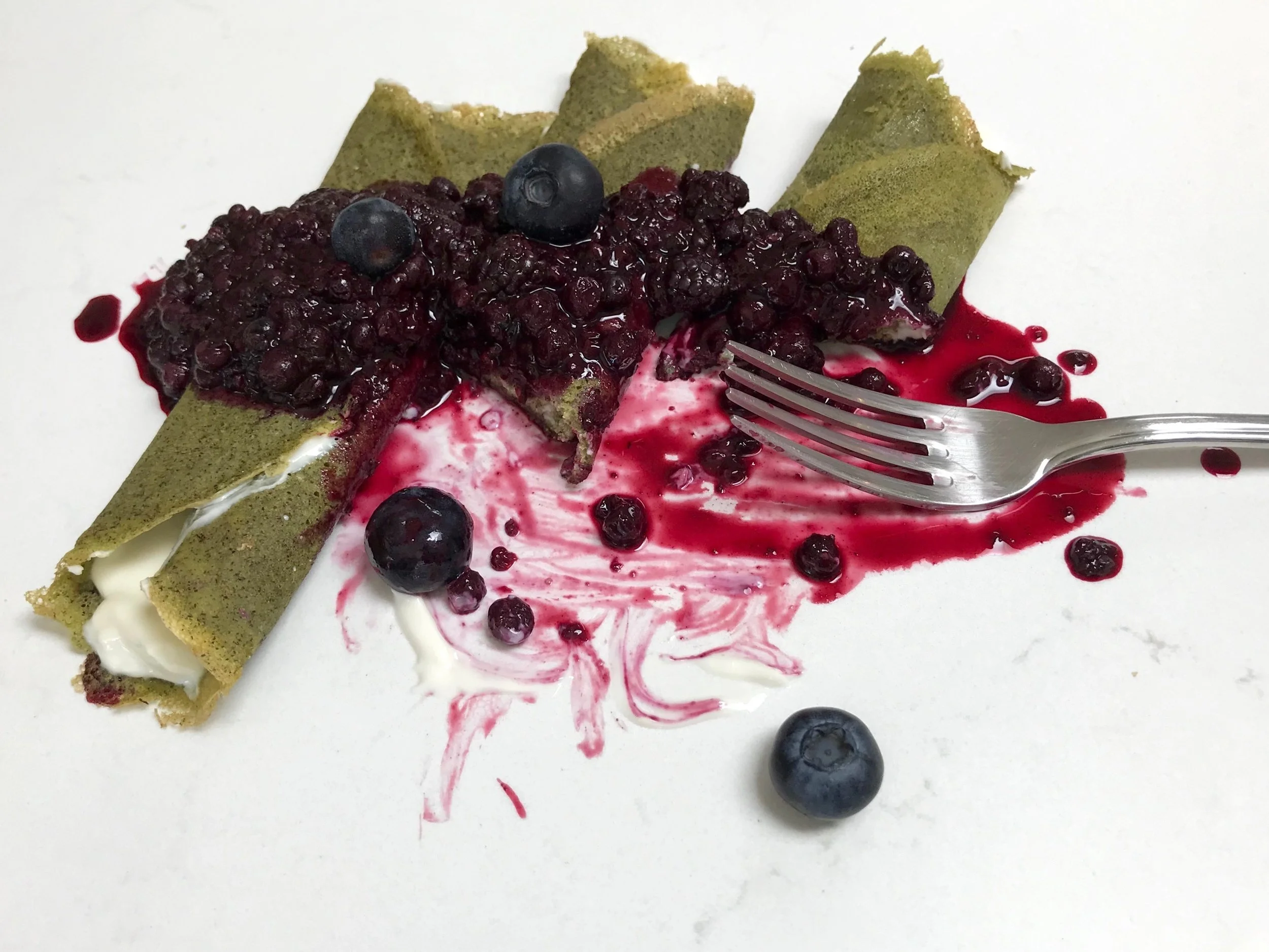 When you’re ready to serve, use the back of a spoon to gently spread a thin layer of yogurt onto each crepe. Then roll, or fold, the crepes and top with a hefty drizzle of berry compote. Serve and enjoy!