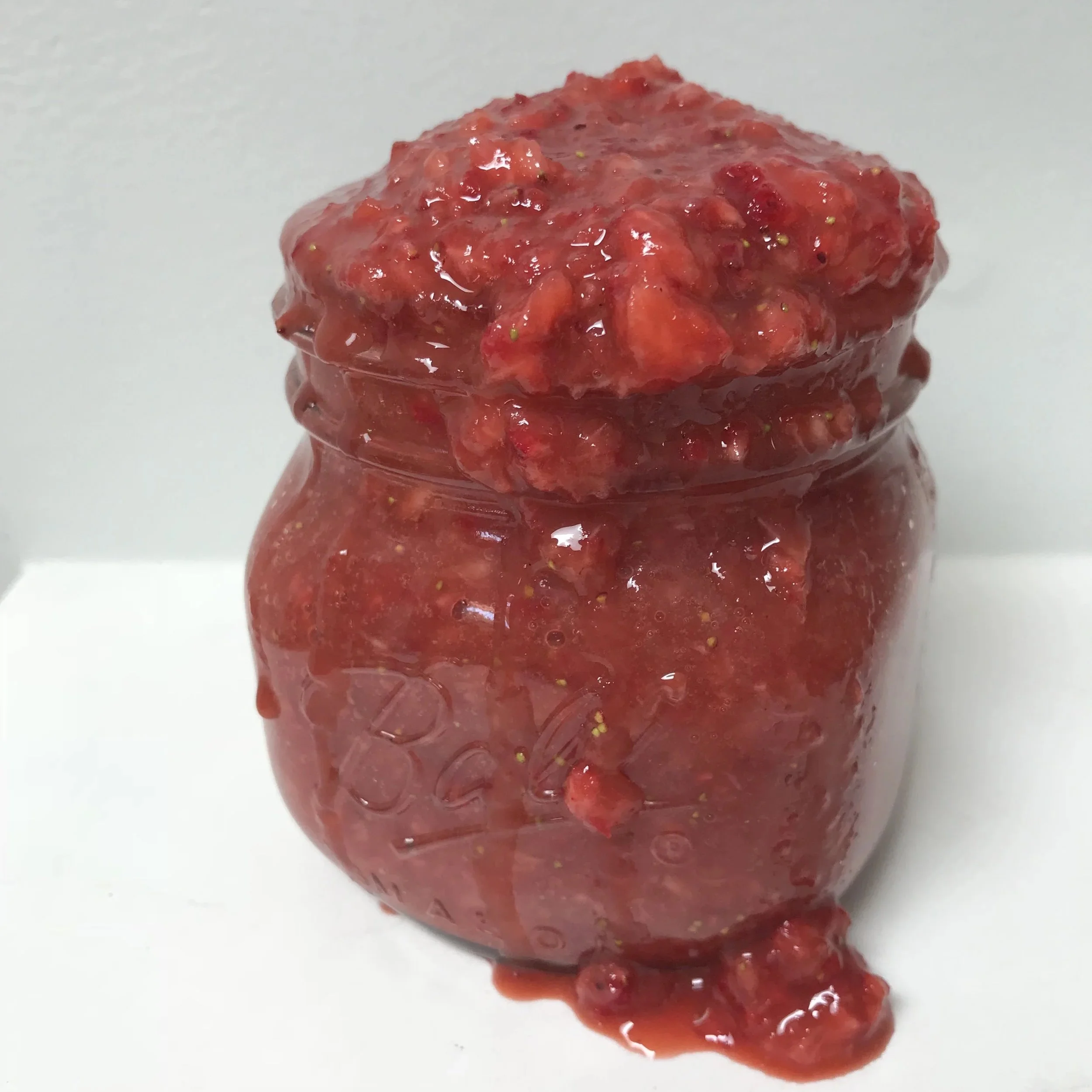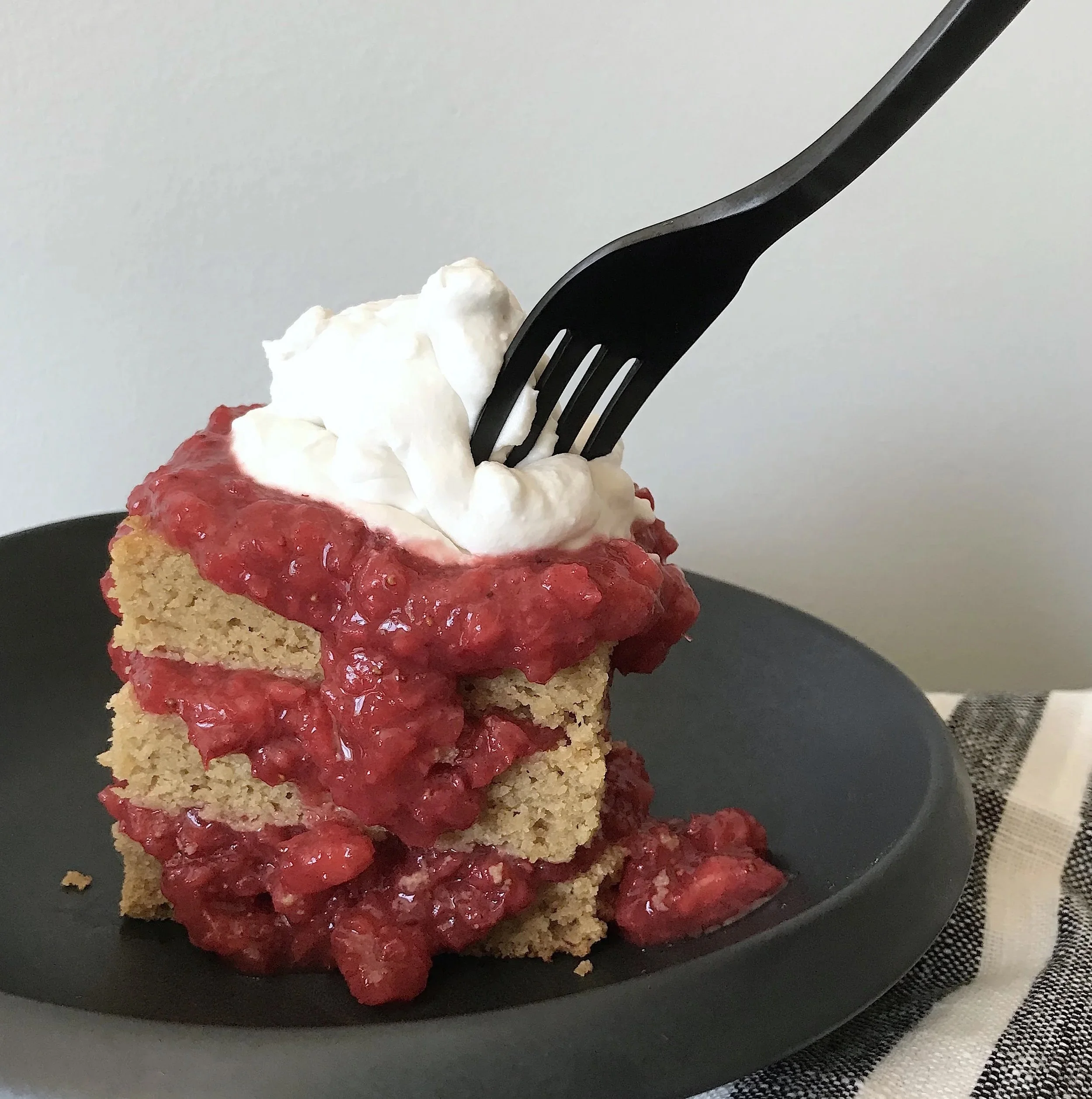 While the cake is baking, rinse and remove stems from strawberries. Place in a blender or food processor with 1 Tbsp. coconut sugar and blend on low until strawberries are the chunky/creamy texture that matches your liking (if you run the machine too long, add some rum and sip on your Daiquiri then try again). Adjust sweetness, as needed.